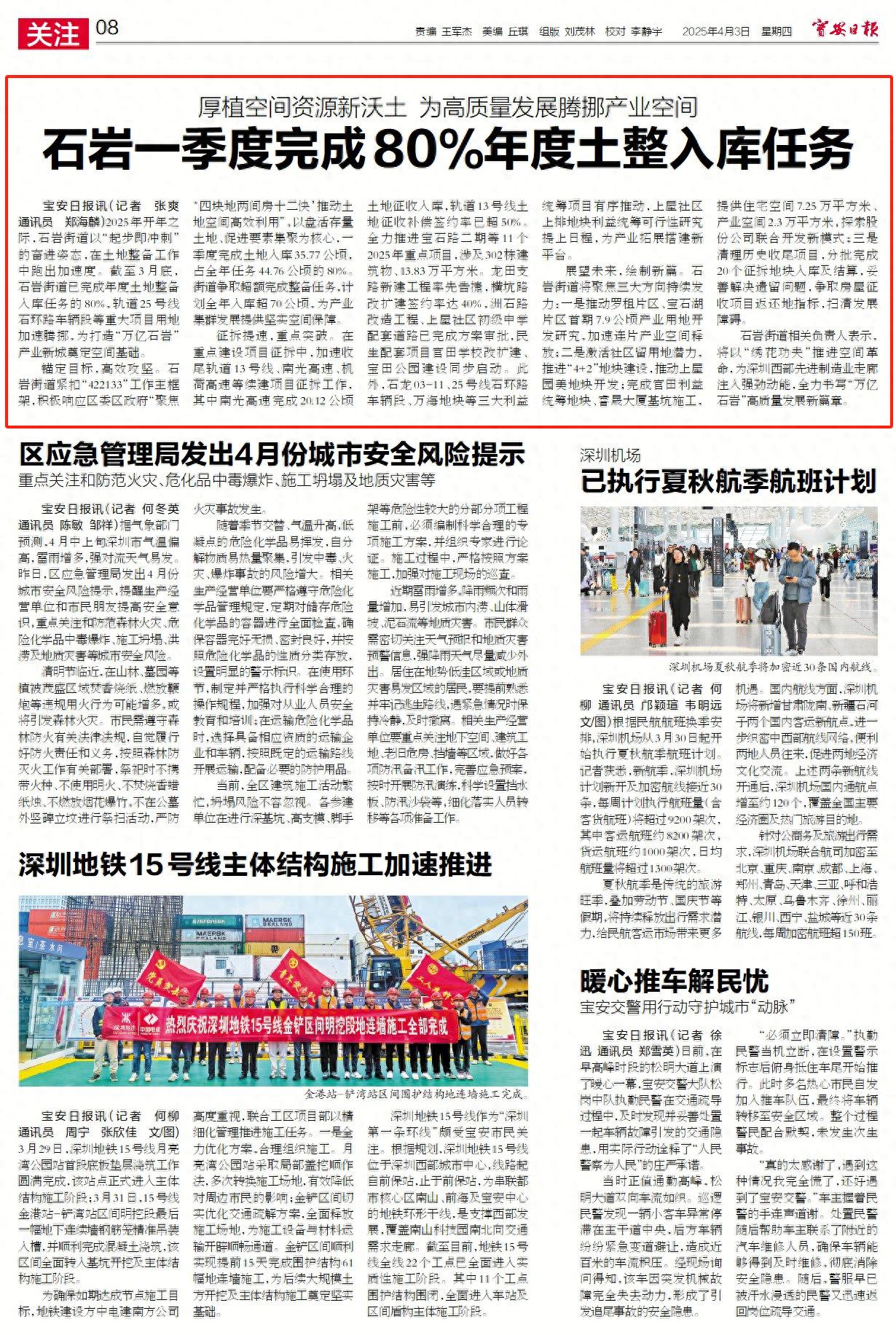 2025年开年之际,石岩街道以“起步即冲刺”的奋进姿态,在土地整备工作中跑出加速度。截至3月底,石岩街道已完成年度土地整备入库任务的80%,轨道25号线石环路车辆段等重大项目用地加速腾挪,为打造“万亿石岩”产业新城奠定空间基础。