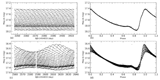 图1 非Blazhko与Blazhko效应天琴座RRab型变星的光变曲线。(a)和(b)为非Blazhko效应天琴座RRab型变星EPIC 212719863的光变曲线,(c)和(d)为Blazhko效应天琴RRab型变星EPIC 220244829的光变曲线。两颗星的相位叠加光变曲线均按其基模式脉动周期进行叠加。
