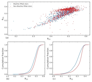 图2 Blazhko和非Blazhko效应RRab型变星的傅里叶参数振幅比R21与R31的分布。(a)展示了两参数之间的关系,(b)和(c)分别展示了两参数的累积分布函数。Blazhko和非BlazhkoRRab型变星分别用不同的颜色表示。