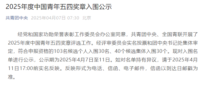 经党和国家功勋荣誉表彰工作委员会办公室同意,共青团中央、全国青联开展了2025年度中国青年五四奖章评选工作。经评审委员会实名投票和团中央书记处集体审定,符合申报资格的103名候选个人入围30名、40个候选集体入围30个。
