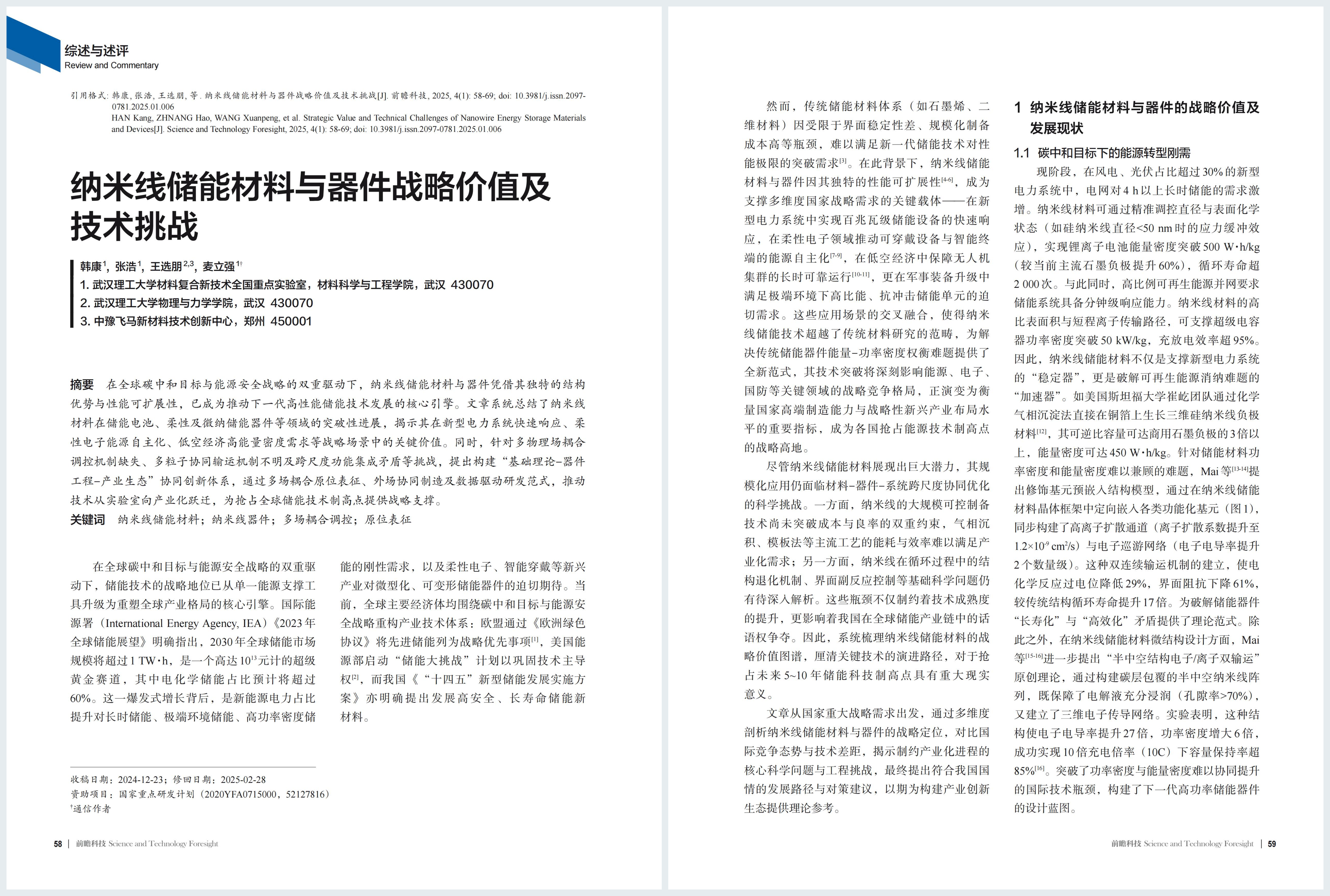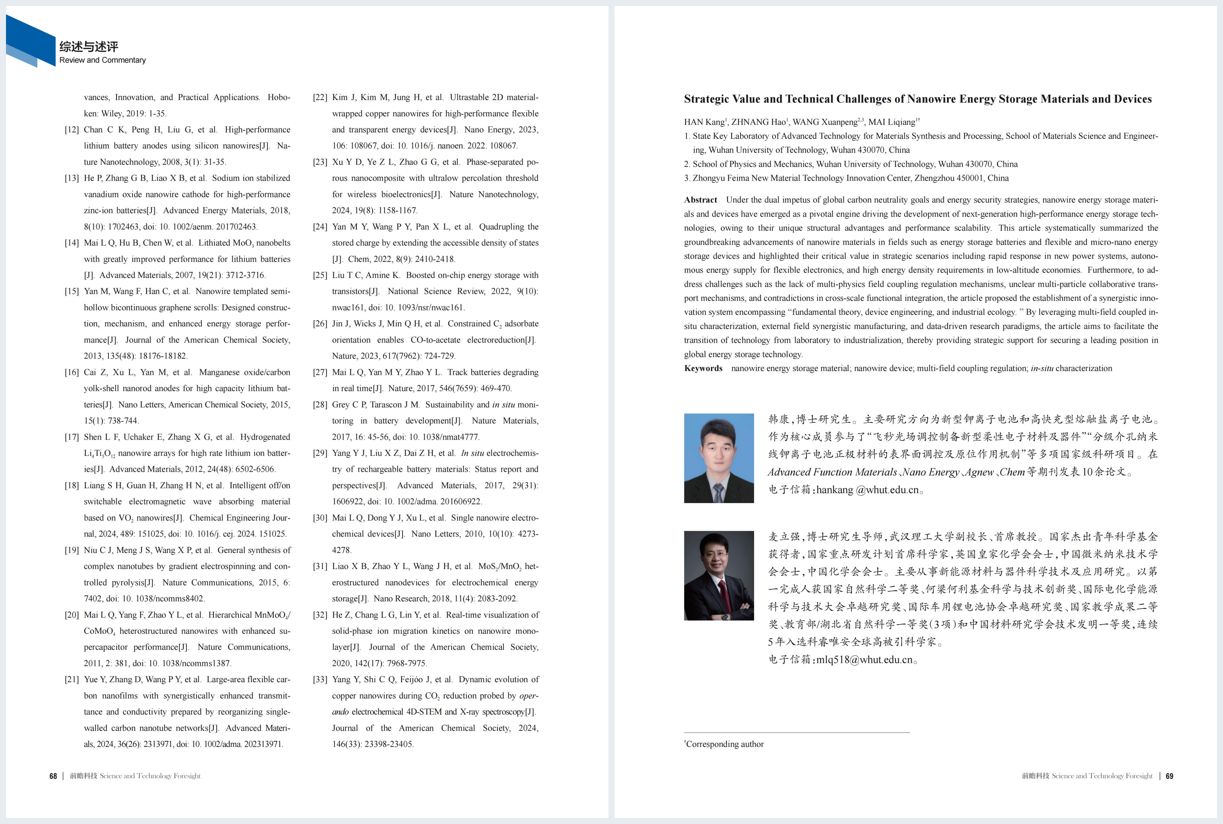 综述与述评 | 韩康,麦立强等:纳米线储能材料与器件战略价值及技术挑战