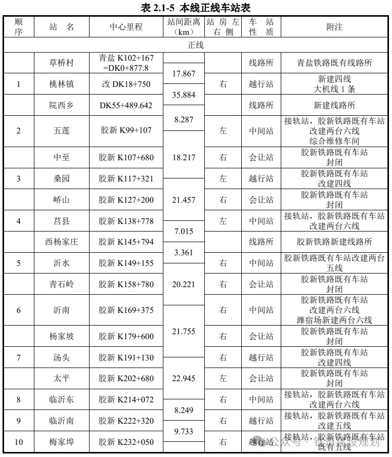 工程全线正线设车站10座,分别为桃林镇站、五莲站、桑园站、莒县站、沂水站、沂南站、汤头站、临沂东站、临沂南站、梅家埠站,其中桃林镇站为新建站,其余车站为胶新铁路既有站改建,另封闭胶新铁路中至站、峤山站、青石岭站、杨家坡站、太平站5座会让站。