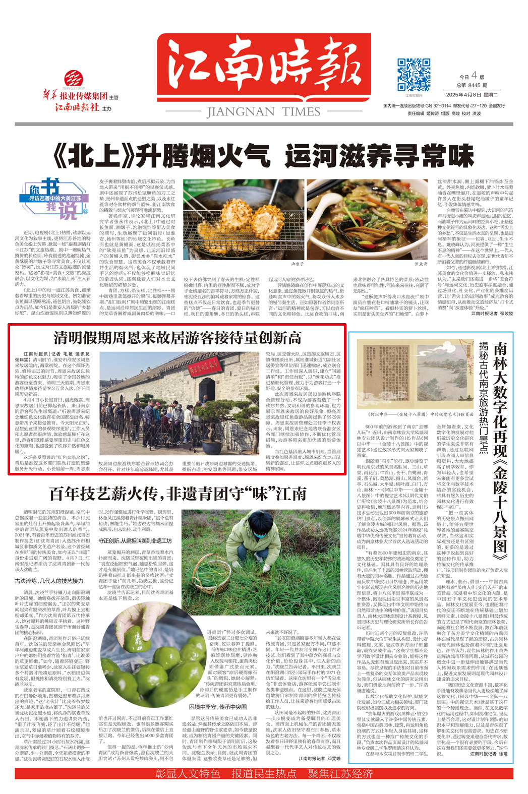 江南时报讯(记者 毛艳 通讯员 张翔雯) 清明时节,淮安市淮安区周恩来故居院内,海棠初绽。在这个缅怀先烈、慎终追远的时节,周恩来故居以独特的红色文化魅力,吸引了全国各地的游客纷至沓来。清明三天假期,周恩来故居热情接待游客3万余人次,创下同期历史新高。