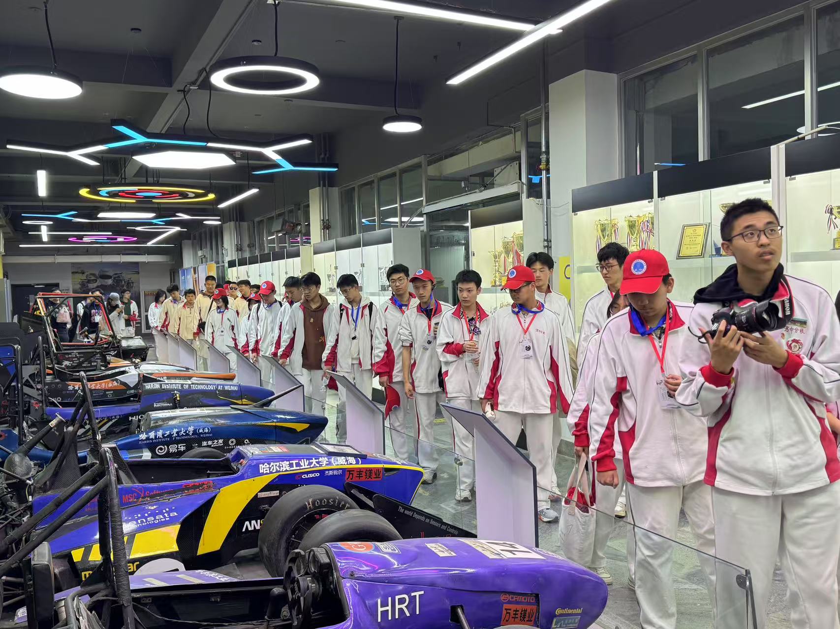 创新创业基地的参访将研学推向高潮。HRT车队工作室里,大学生们正在调试方程式赛车底盘,碳纤维车架上密布的传感器与数据线,让机械原理课上的知识瞬间“活”了起来。在国家级智能制造实验室,工业机器人精准执行着焊接指令,3D打印设备层层堆叠出精密零件。一名同学在日志中感慨:“以前觉得科技创新遥不可及,今天发现它就在一次次调试、一毫米精度的坚持中。”