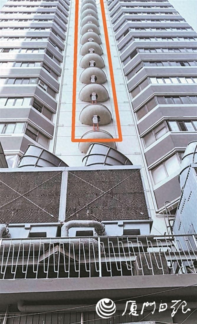 记者在现场看到,该逃生梯位于湖光大厦的外立面,有30层楼高。从下往上看,逃生梯每层设有一个中空的圆弧,与常见的直梯式逃生通道截然不同。