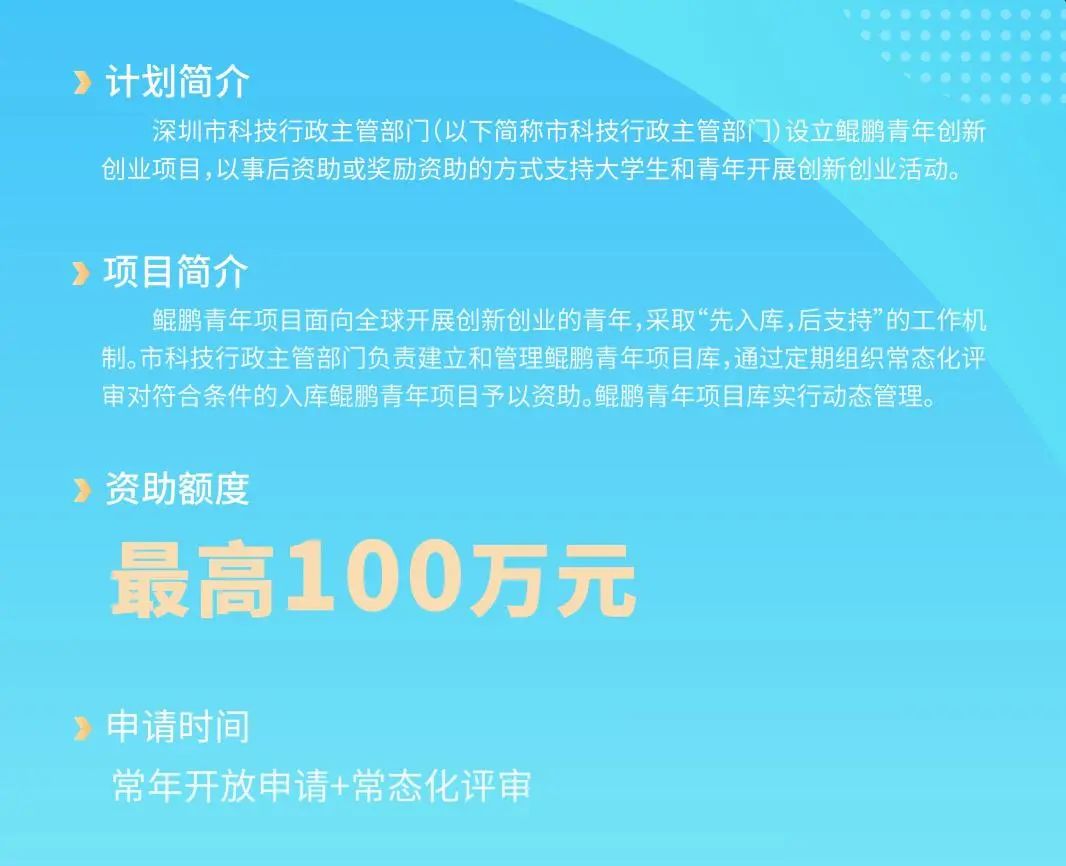 深圳推出了“鲲鹏青年创新创业合作计划”,入库项目可获得最高100万元研发资助支持。对来深创业的留学归国人员和港澳青年,提供留创园和港澳青年创新创业基地等场地支持,最高100万元的创业补贴和奖励。对来深创业的大学生,提供涵盖一次性创业资助、场地租金补贴、创业担保贷款及贴息的一系列扶持政策。