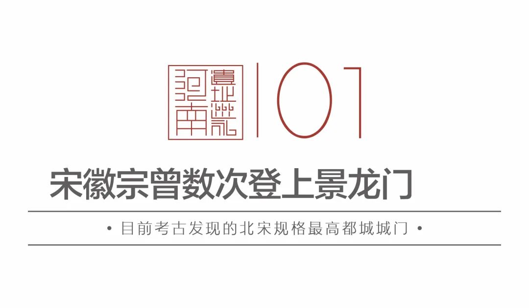 发掘材料显示,景龙门为一门三道布局,城门通阔约60米,门道进深约19.3米,三门道宽度相同,均约5.6米。延福宫东墙位于景龙门西南侧,北半部叠压于晚唐五代—北宋旧城(内城)北墙之上,与《宋史》记载“其后又跨旧城修筑,号延福第六位”内容相符。考古发现延福宫东墙紧贴景龙门西侧,印证了《宋史》记载延福五位“东直景龙门”相关内容的真实性。