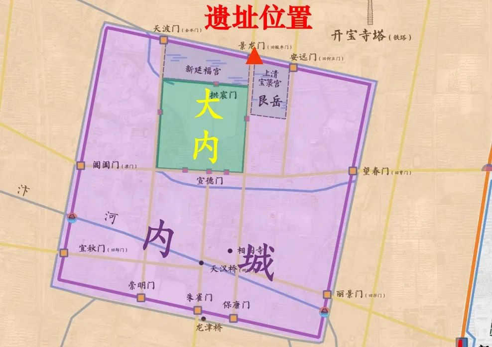 据开封市文物考古研究院公布的景龙门遗址位置图可以看出,景龙门是北宋东京城内城北中门,位于大内东北方向。