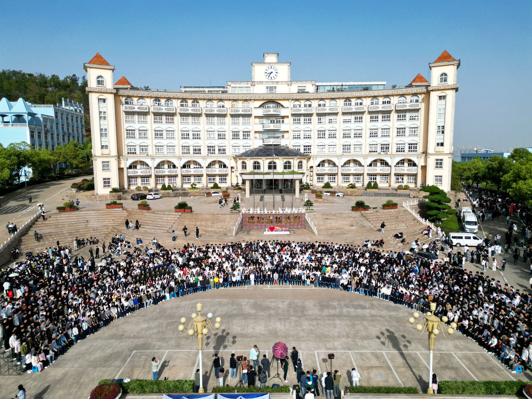 人工智能学院1600余名师生参与成为拍摄人数最多的学院,而影视传媒学院则以专业特色吸引了众多目光:舞蹈专业的学生身着轻盈的舞蹈服,翩翩起舞的姿态如同灵动的精灵;空乘专业的学生则换上笔挺的职业装,优雅的气质和专业的风范成为镜头下一道亮丽的风景线,引得现场师生纷纷点赞。