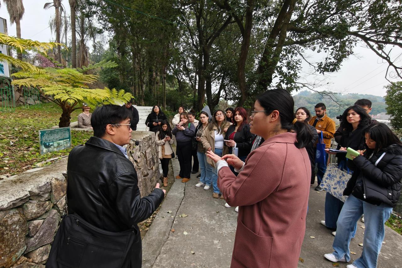 今年3月,美国肯恩大学本科生参观浙江省亚热带作物研究所,胡青荻在向他们介绍笔筒树。受访者供图