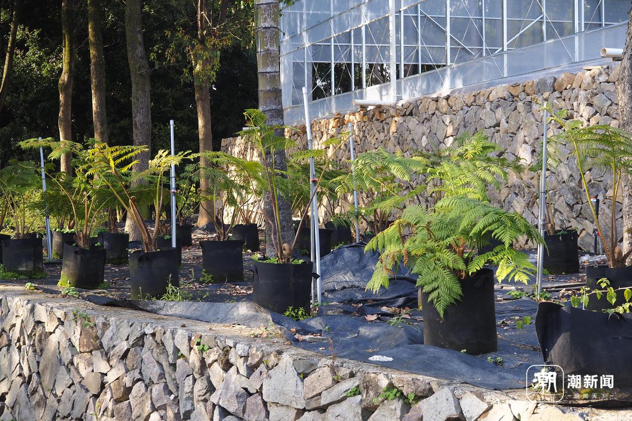 在研究所基地,一盆盆笔筒树陈列摆放在林下“晒太阳”,胡青荻比划给我们看,茎出土约15厘米,地上部分60-80厘米,“这样的笔筒树就能正式回归野外土壤了,目前野外回归的成活率在70%以上”。