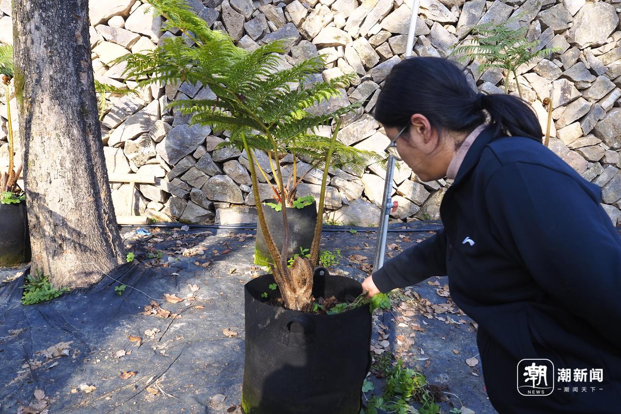 胡青荻在给盆栽中的笔筒树除杂草。潮新闻记者 吴馥梅 摄