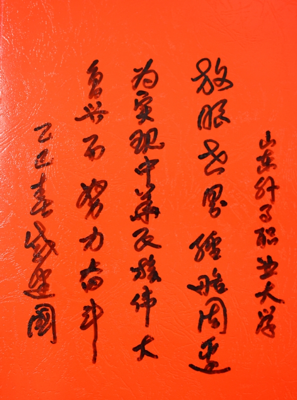 在座谈会的最后,王伟光、戚建国分别为山外大学子写下寄语。王伟光希望同学们“刻苦学习,时刻准备,成为合格的外事人才”;戚建国勉励同学们“放眼世界,经略周边,为实现中华民族伟大复兴而努力奋斗”。两份寄语字迹遒劲有力,寓意深远,为学校师生注入了强大的精神动力,激励全校师生在新时代的新征程上奋勇前行。