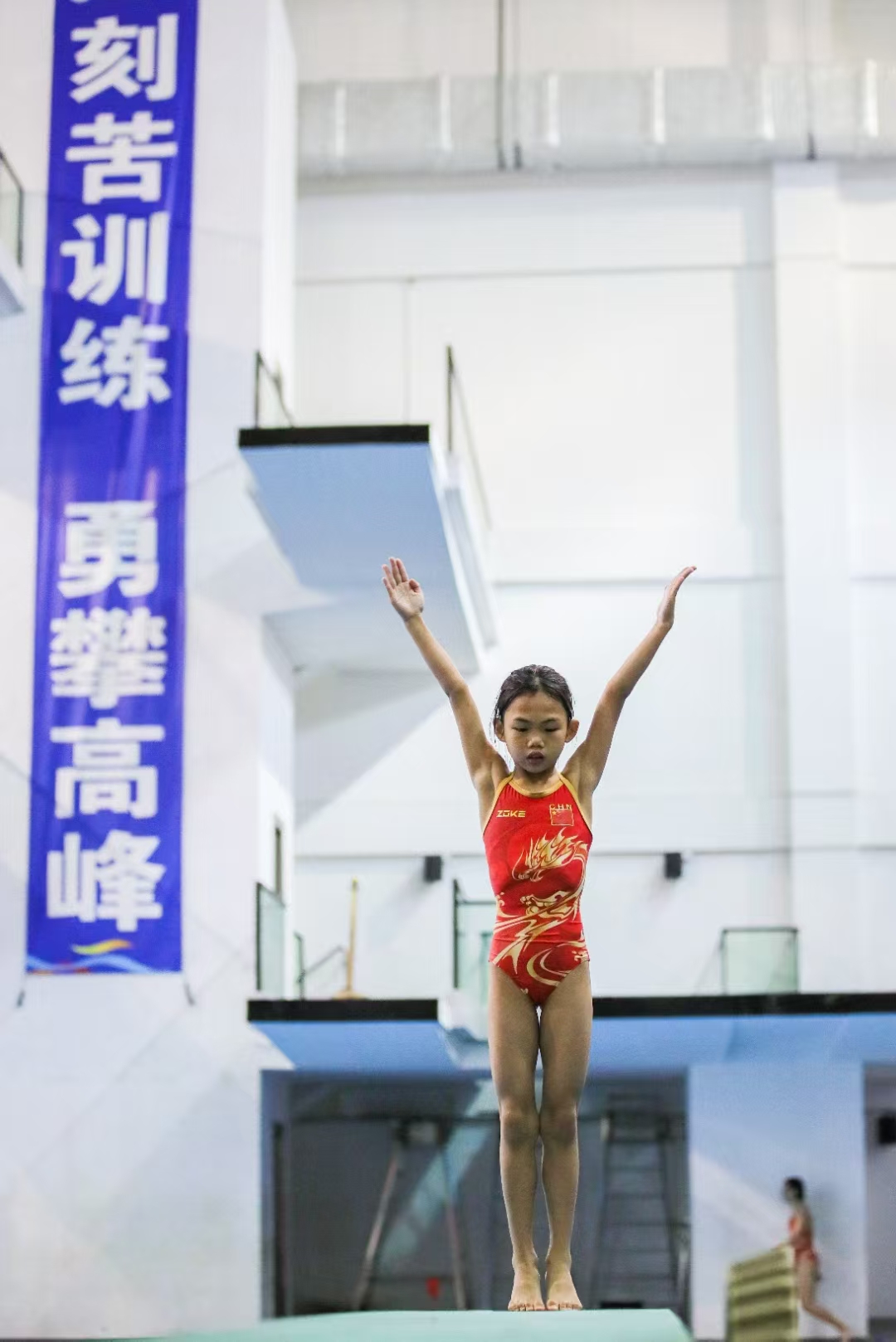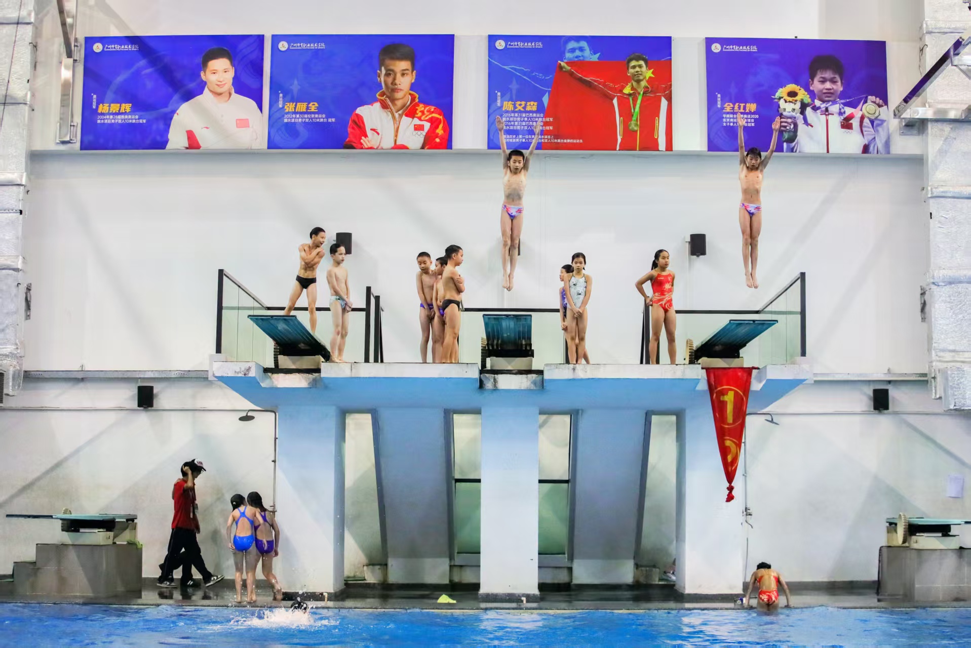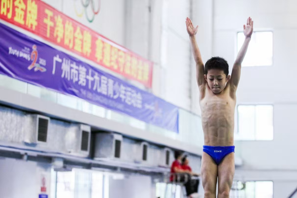 4月20日,广州体育职业技术学院跳水馆,来自广州各区的257名跳水小将们,展开广州市第十九届青少年运动会跳水比赛的激烈角逐,馆内悬挂着杨景辉、张雁全、陈艾森、全红婵等4名广州跳水奥运冠军大照片,在四位奥运冠军的“注视”下,跳水小将走上跳板、跳台,起跳、做动作、入水,一气呵成,场馆内的标语“敢于拼搏勇挑重担精雕细琢再创辉煌”、“刻苦训练勇攀高峰”……格外醒目。