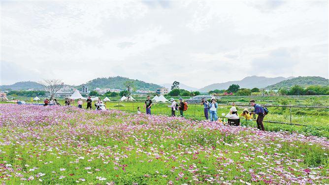 眼下,“田洋花海”正值盛放期,粉白交织的波斯菊沿着西溪肆意生长。“五一”假期将至,田洋村向市民游客发出旅游邀约。