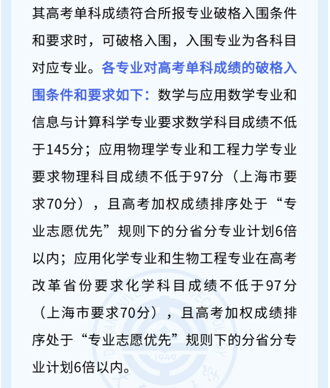 大连理工大学明确,数学与应用数学专业和信息与计算科学专业要求数学科目成绩不低于145分;应用物理学专业和工程力学专业要求物理科目成绩不低于97分(上海市要求70分),且高考加权成绩排序处于“专业志愿优先”规则下的分省分专业计划6倍以内;应用化学专业和生物工程专业在高考改革省份要求化学科目成绩不低于97分(上海市要求70分)且高考加权成绩排序处于“专业志愿优先”规则下的分省分专业计划6倍以内。