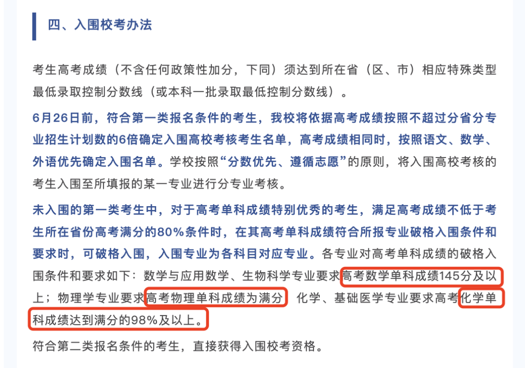 华中科技大学未入围的第一类考生中,高考成绩不低于考生所在省份高考满分的80%,数学与应用数学、生物科学专业要求数学145分及以上;物理学专业要求高考物理满分;化学、基础医学专业要求高考化学达到满分的98%及以上即可破格入围。