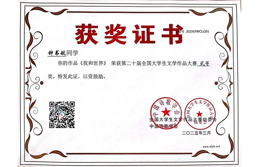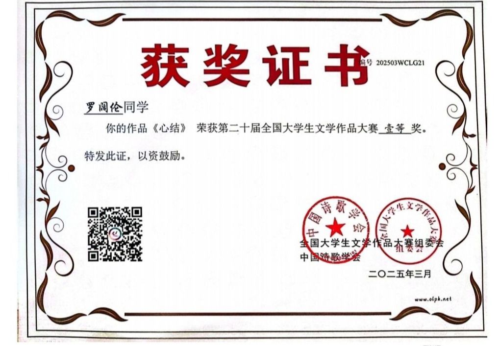 “我为这42位获奖同学感到由衷地自豪。他们的成绩不仅体现了个人文学创作的才华,更是文法学院长期以来注重人文素养培养、鼓励创新实践的成果。”文法学院团委书记汪慧蓉在接受采访时表示,“文学创作需要热情,更需要良好的土壤。我们会继续营造开放、包容的创作环境,让更多学生敢于表达、勇于突破,在文学道路上走得更远,为培养更多优秀的文学人才而不懈努力。”(袁婷)