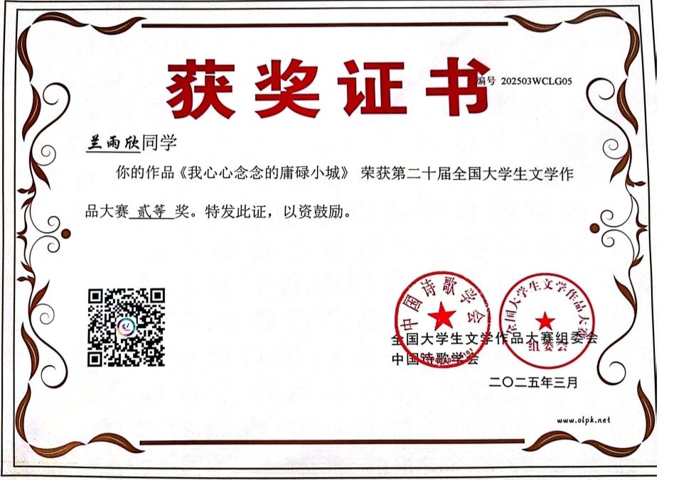 在本次大赛中,武昌理工学院汉语言2308班罗阔伦同学的作品《心结》荣获一等奖,成为众多优秀作品中的佼佼者。这篇散文以作者的真实生活经历为蓝本,生动地讲述了主人公从农村走向城镇生活的过程中,所面临的城乡差异以及成长中的道德困境。作品以细腻的笔触、真挚的情感,深刻地展现了主人公在困境中对“良知”重要性的深刻领悟,引发了读者的强烈共鸣,展现了作者扎实的文学功底和独特的创作视角。