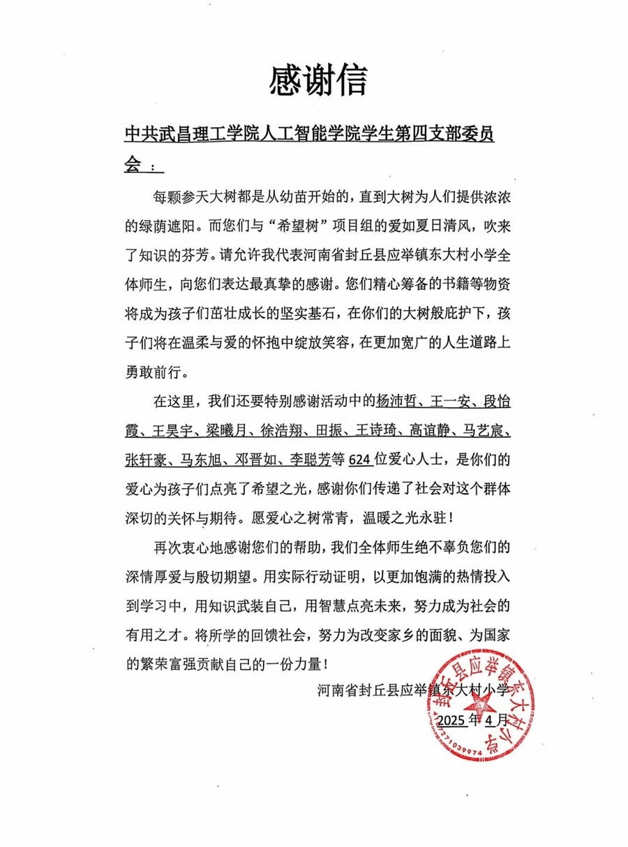 “每棵参天大树都是从幼苗开始的,直到大树为人们提供浓浓的绿荫遮阳。而你们与“希望树”项目组的爱如夏日清风,吹来了知识的芬芳。”近日,河南省封丘县应举镇东大村小学向武昌理工学院发来一封感谢信,赞扬武昌理工学院学生的无私奉献精神,并对武昌理工学院向东大村小学捐赠书籍等物资的行为表示深深的感谢之情。