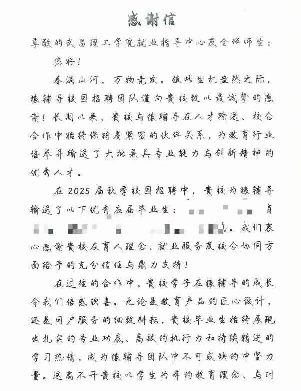 北京猿辅导在信中写道:“从校招的精准动员、双选会的高校组织,到实习衔接的全程护航,贵校始终以学生需求为核心,搭建起校企无缝对接的桥梁。这种双向奔赴的合作精神,令猿辅导团队深受感动,也让我们对未来深化合作充满信心。”