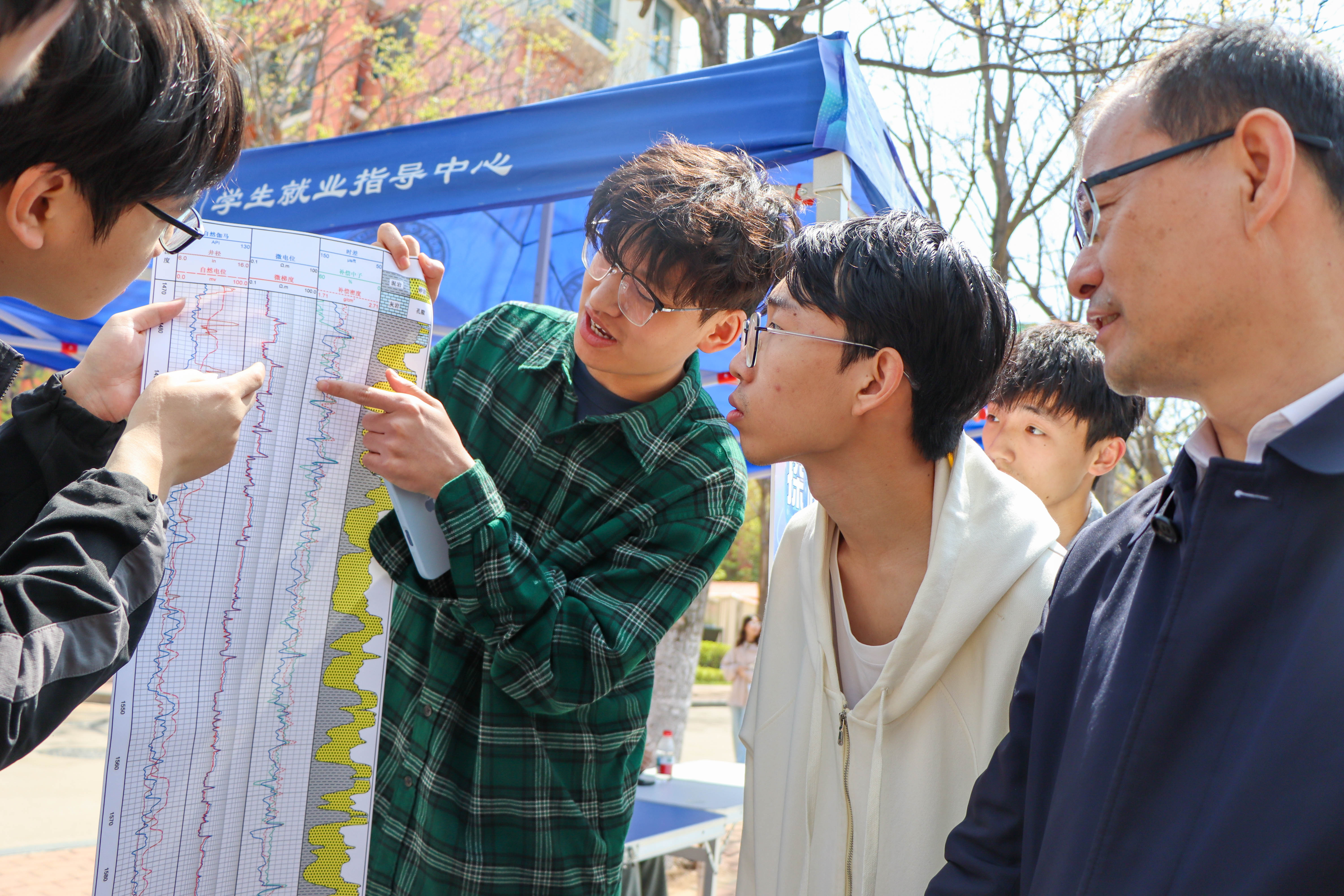 “每一米岩芯,都是国家能源安全的‘密码本’!”4月20日上午,在中国石油大学(华东)荟萃广场,地质学2021级本科生张胜博正在向同学们讲解自己的作品,这个复刻我国首口万米科探井“深地塔科1井”的模型被好奇的同学们团团围住。