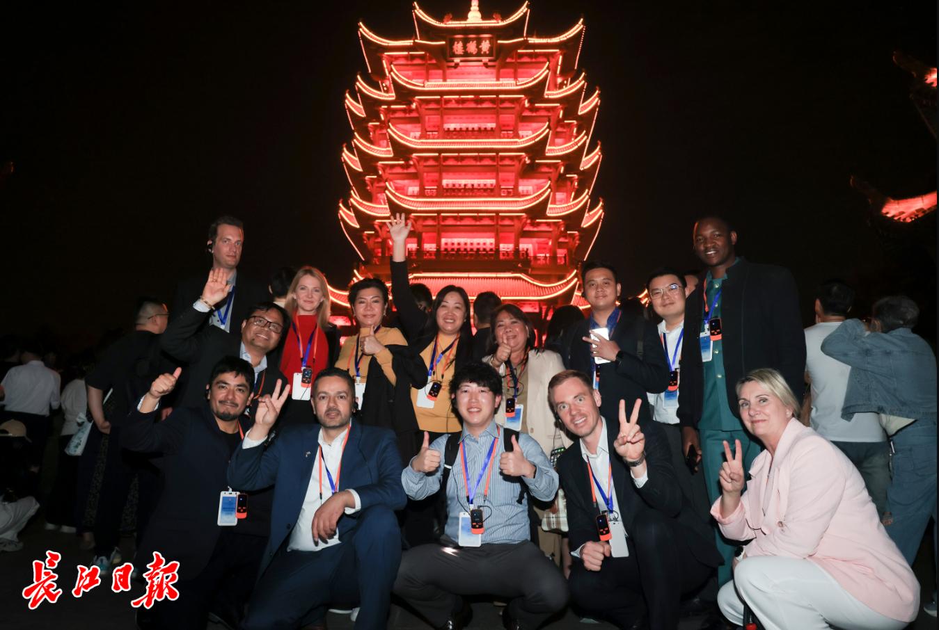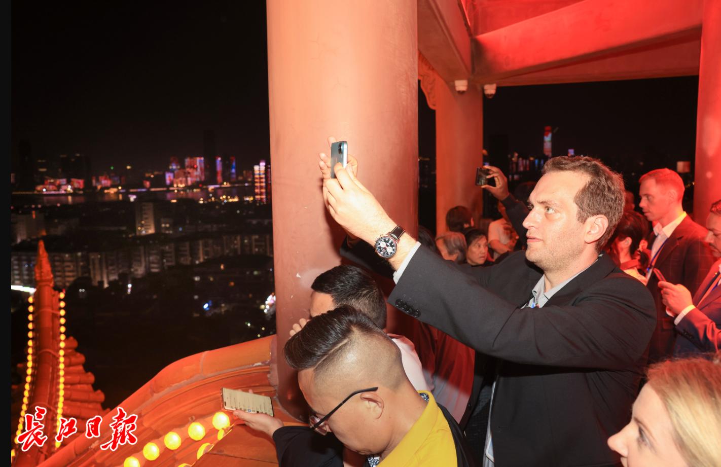 国际友人来到黄鹤楼,一览两江夜景。
