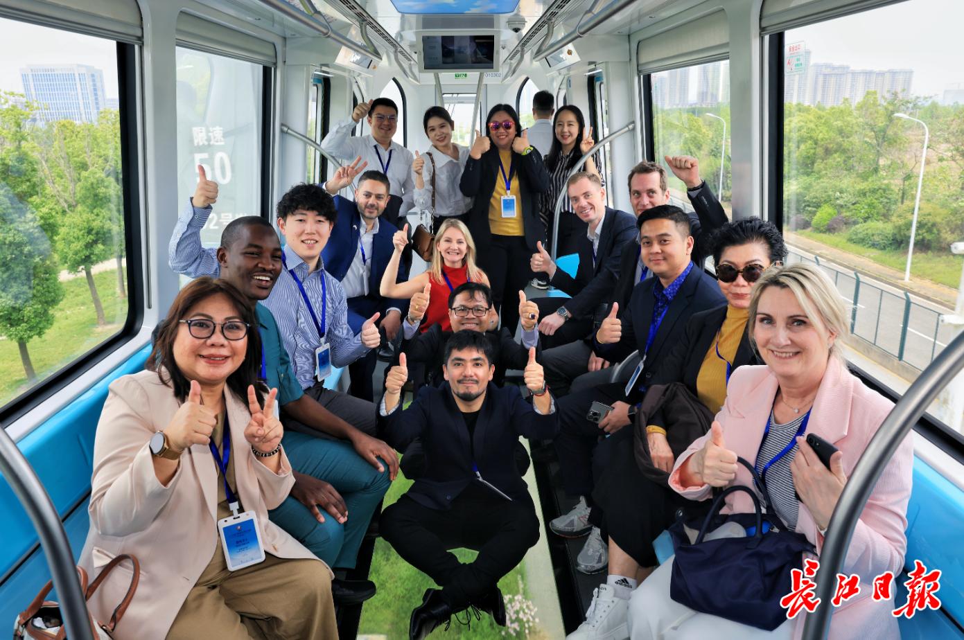 国际友人体验武汉光谷空轨。