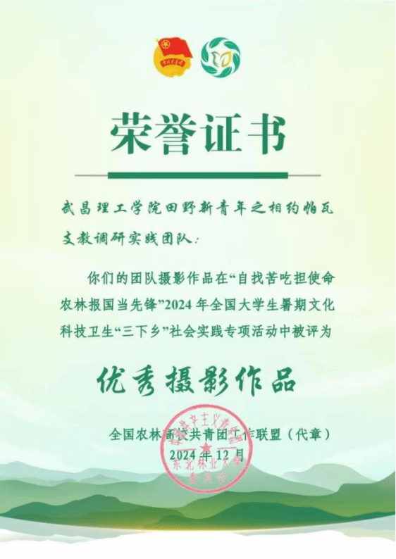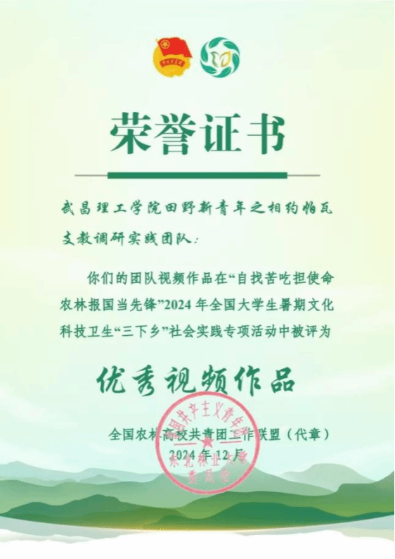 近日,全国农林高校共青团工作联盟传来喜讯,武昌理工学院影视传媒学院"田野新青年之相约帕瓦"支教调研实践团队在“自找苦吃担使命,农林报国当先锋”2024年全国大学生暑期文化科技卫生“三下乡”社会实践专项活动中表现卓越,荣获优秀摄影作品奖和优秀视频作品奖。