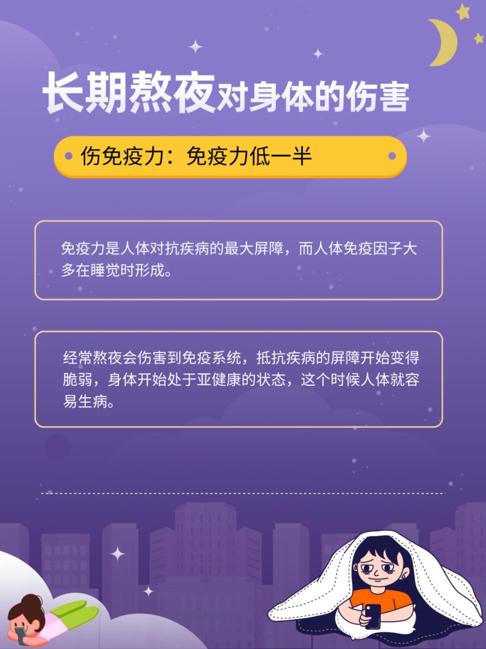 经常熬夜会导致人体的免疫系统受损抵抗能力下降,诱发疾病的概率会大大提高,因为人体免疫是抵抗疾病的关键要素,然而免疫因子的形成是建立在大量的睡眠时间基础上的,所以熬夜是直接破坏免疫系统的罪魁祸首。