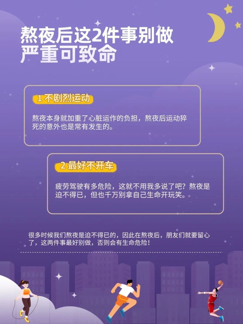 2.熬夜之后千万不要剧烈运动,容易加重心脏负担。