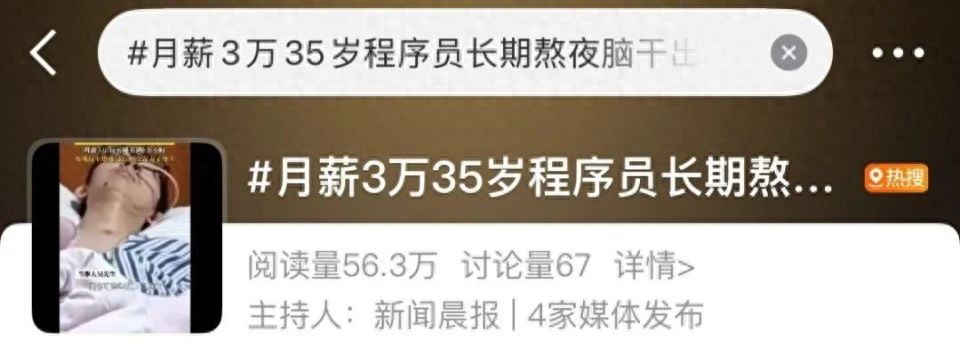 据报道,该程序员姓吴,是一位有8年工作经验的程序员。因长期熬夜,脑干出血5毫升,昏迷15天,在ICU躺了28天。他在接受媒体采访时表示,自己从事的工作月薪3万元,每天早上7点起床凌晨一两点睡下。