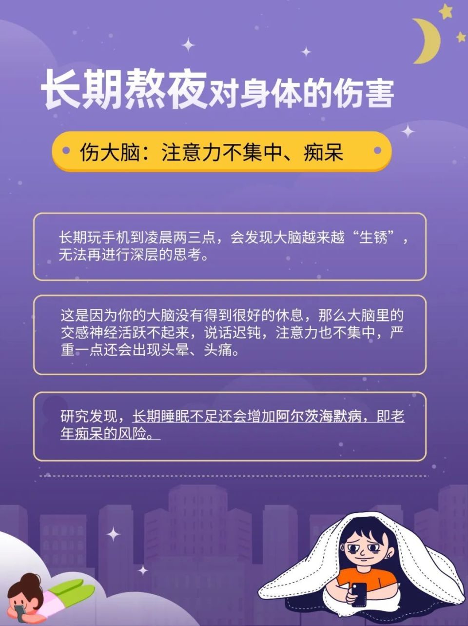 熬夜、睡眠不足使你的大脑因没有得到很好的休眠而受损、注意力不集中、精神不济,甚至出现头疼、头晕等症状。