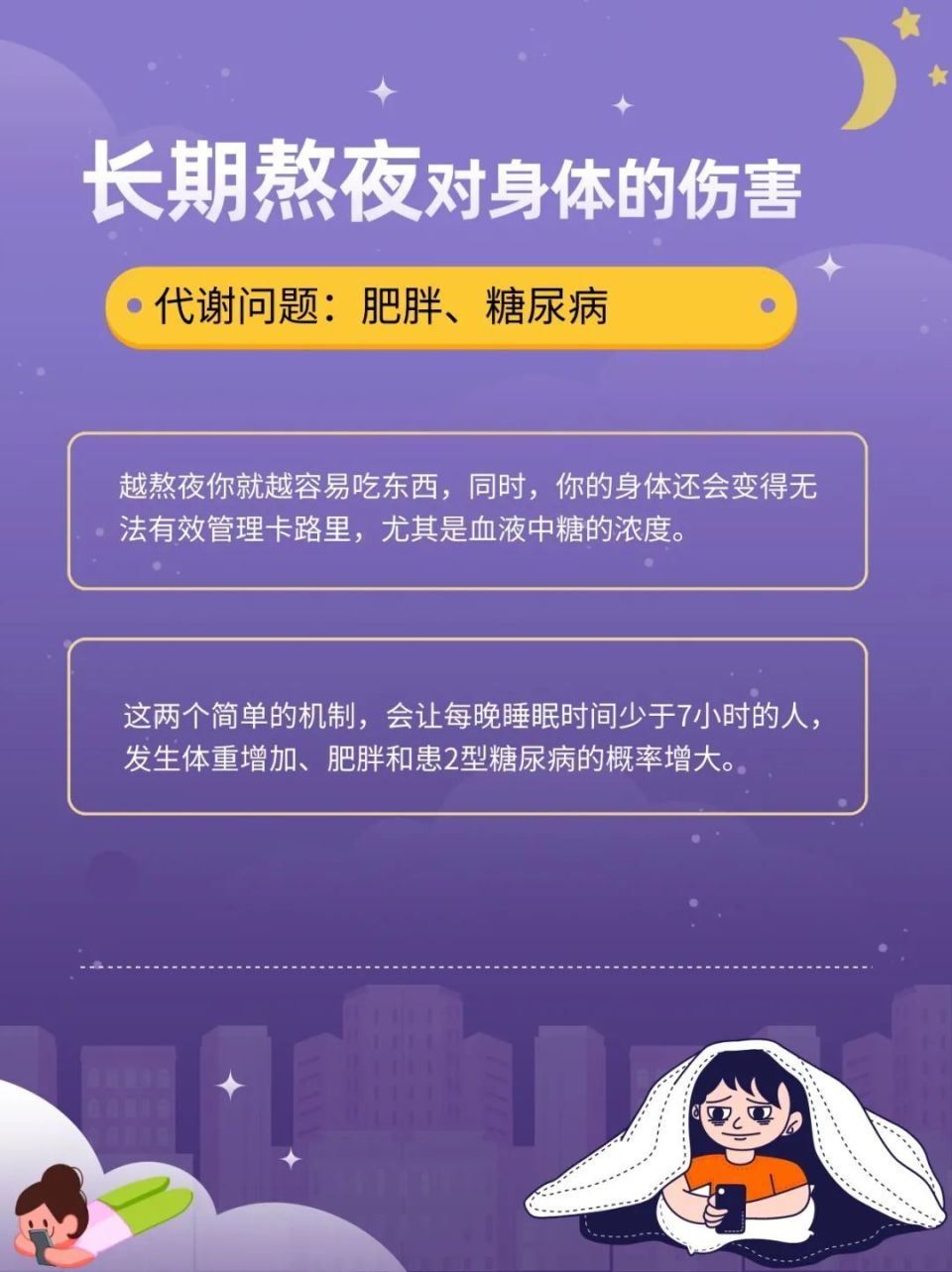 在熬夜睡眠不足的情况下生长激素的分泌会明显减少,严重影响人体的健康生长发育,同时熬夜会破坏你的新陈代谢,让你吃东西后无法有效管理你的卡路里和血液中糖的浓度,从而体重开始受影响增大。
