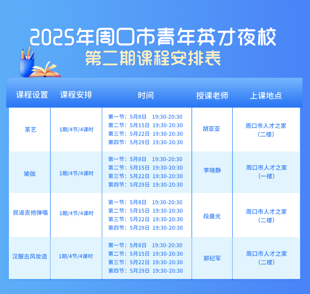 2025年周口市青年英才夜校第二期将于5月8日正式开课,授课时间为5月8日—5月29日,期间每周四的19:30—20:30上课。