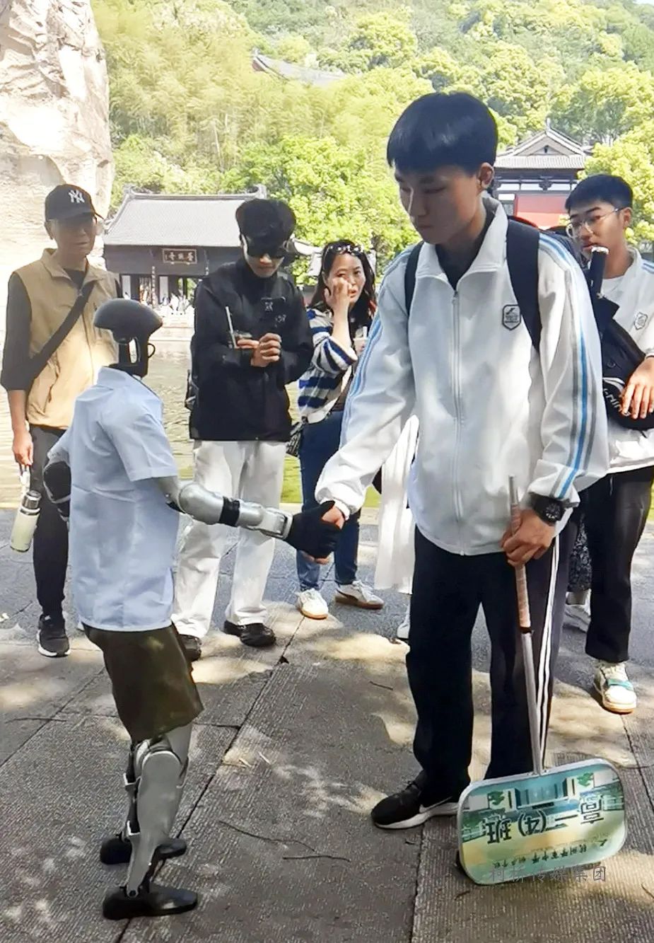 “来,跟我握手!”近日,一群游客围聚在鉴湖景区柯岩大佛下,目光聚焦于一台通体银白、圆头圆脑的智能机器人。它穿着白衬衫,金属关节灵活转动,时而向游客挥手致意,时而与驻足的小游客完成“握手约定”,引得人群中不时爆发出惊叹与欢笑。同时出现的,还有可爱的机器狗,这对科技感十足的“机器组合”走在鲁镇街头,和游客们一起比爱心,与阿Q、祥林嫂等鲁迅笔下经典人物形成奇妙反差,颇具现代感。