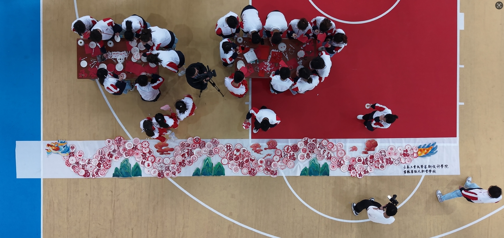 活动现场最引人注目的当属两校学生共同创作的百米“纸韵游龙”非遗主题作品。大学生志愿者们运用立体构成专业知识,带领青少年在纸盘上绘制祥云图案并剪出龙鳞纹样,再通过立体绘画技法制作出栩栩如生的龙头、龙爪等部件,最终将300余个装饰着剪纸龙鳞和祥云纹样的纸盘拼接成一条蜿蜒百米、气势恢宏的“中国龙”。活动负责人陈卓琪表示,“这次实践让我们跳出了课堂的条条框框,在真实的互动中感受到传统文化的生命力。”吉林省孤儿职业学校一名正在剪纸龙鳞的学生表示,“这是我第一次接触非遗,原来传统文化这么美!尤其是和哥哥姐姐们一起完成百米巨龙,特别有成就感!”