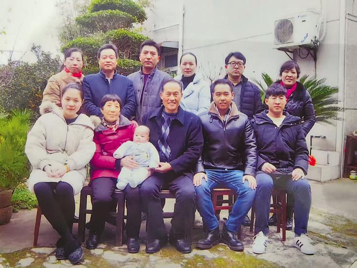 姚忠信(前排右二)、姚洪亮(后排左二)父子及家人。