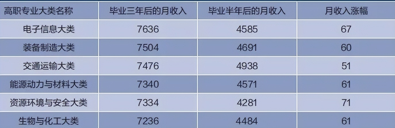 从毕业三年后的月收入来看,电子信息类、装备制造类、交通运输类月收入排前三位,均超过 7400 元。这表明,在一些技术密集型行业,具备专业技能的高职毕业生具有显著竞争力,其薪酬也具有不错的上升空间。
