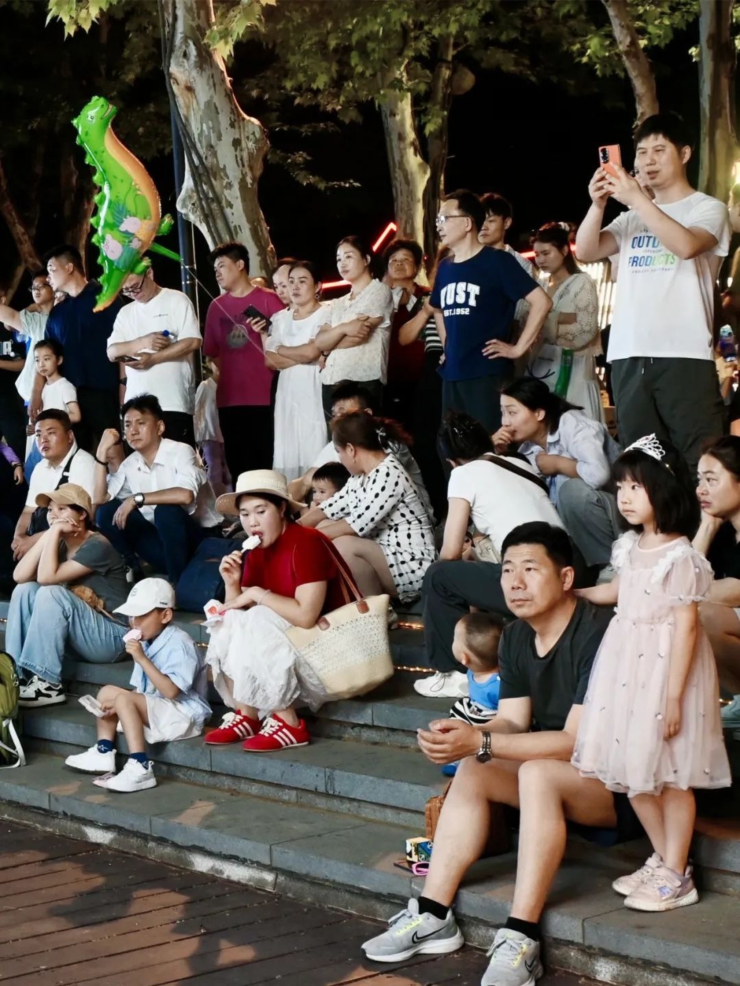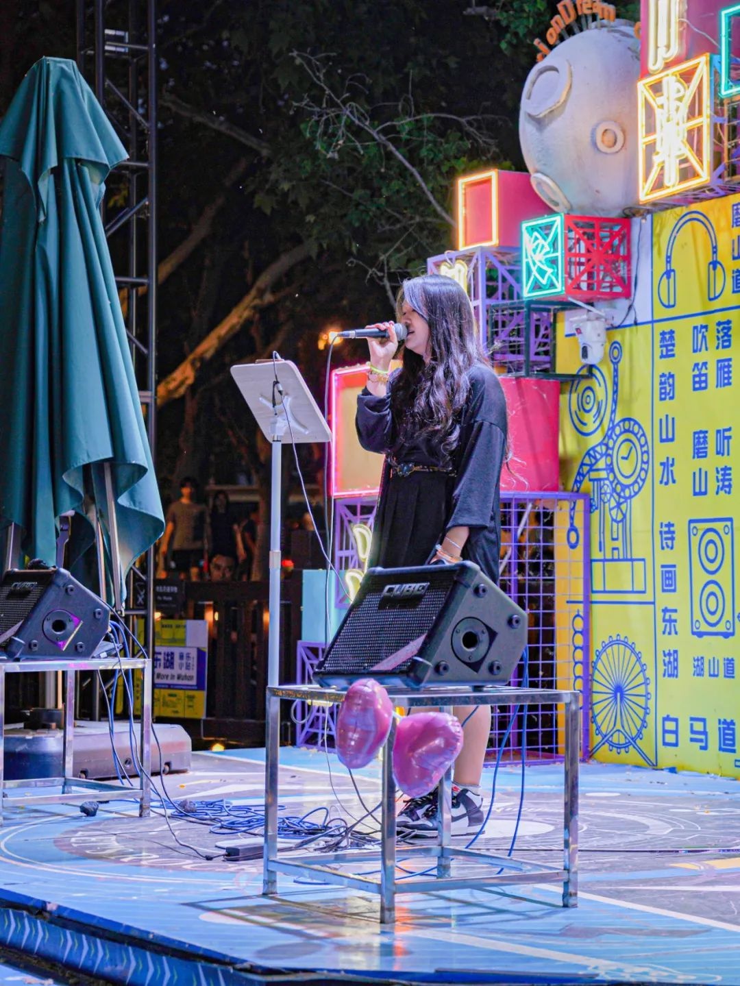 在东湖凌波门平湖珞樱观湖平台,星光与音符交织,舞台上歌手磁性的声线裹着潮湿水汽扑面而来,台下的观众不自觉地跟着旋律摇晃。来自吉林的游客陈盛一边轻声跟唱一边用手机拍视频:“舞台置于山水之中,头上是星星点点的夜空,远处是若隐若现的城市轮廓,吹着晚风听着歌,太惬意了!”