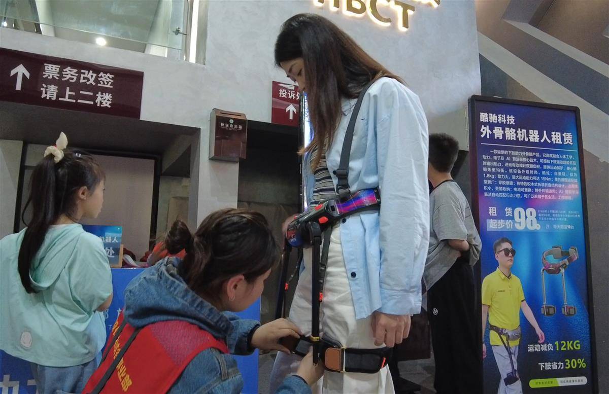 恩施大峡谷景区是国家5A级旅游景区,年接待游客200余万人。5月1日,在景区游客中心,来往的游客络绎不绝。来自四川成都的唐思雨一家人刚买完票,目光便被售票大厅一旁的外骨骼机器人所吸引。“外骨骼机器人是什么?有什么作用?”