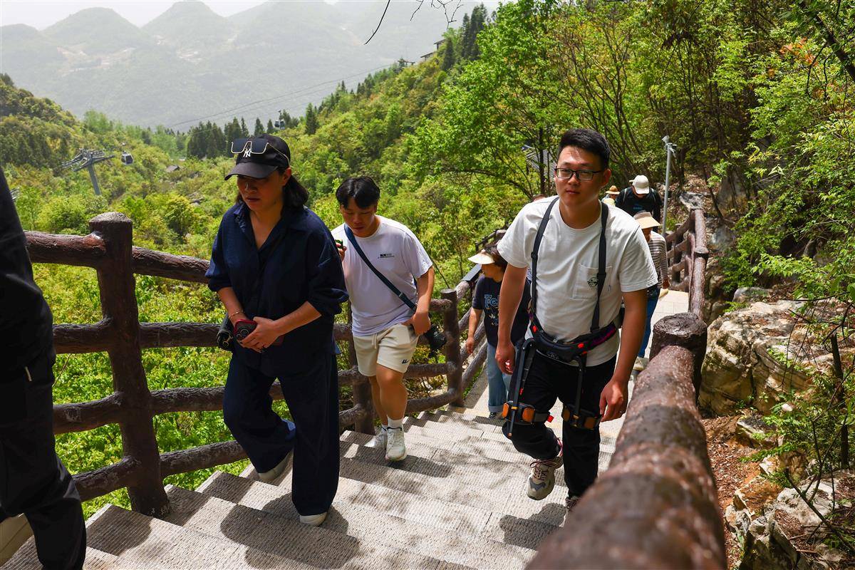 “五一”假期,恩施大峡谷景区迎来科技助力新体验。景区准备的近50套登山助力外骨骼机器人正式投入运营。游客花98元就能体验三小时的“租腿登山”,爬山仿佛开了“外挂”,从此告别“望山兴叹”。