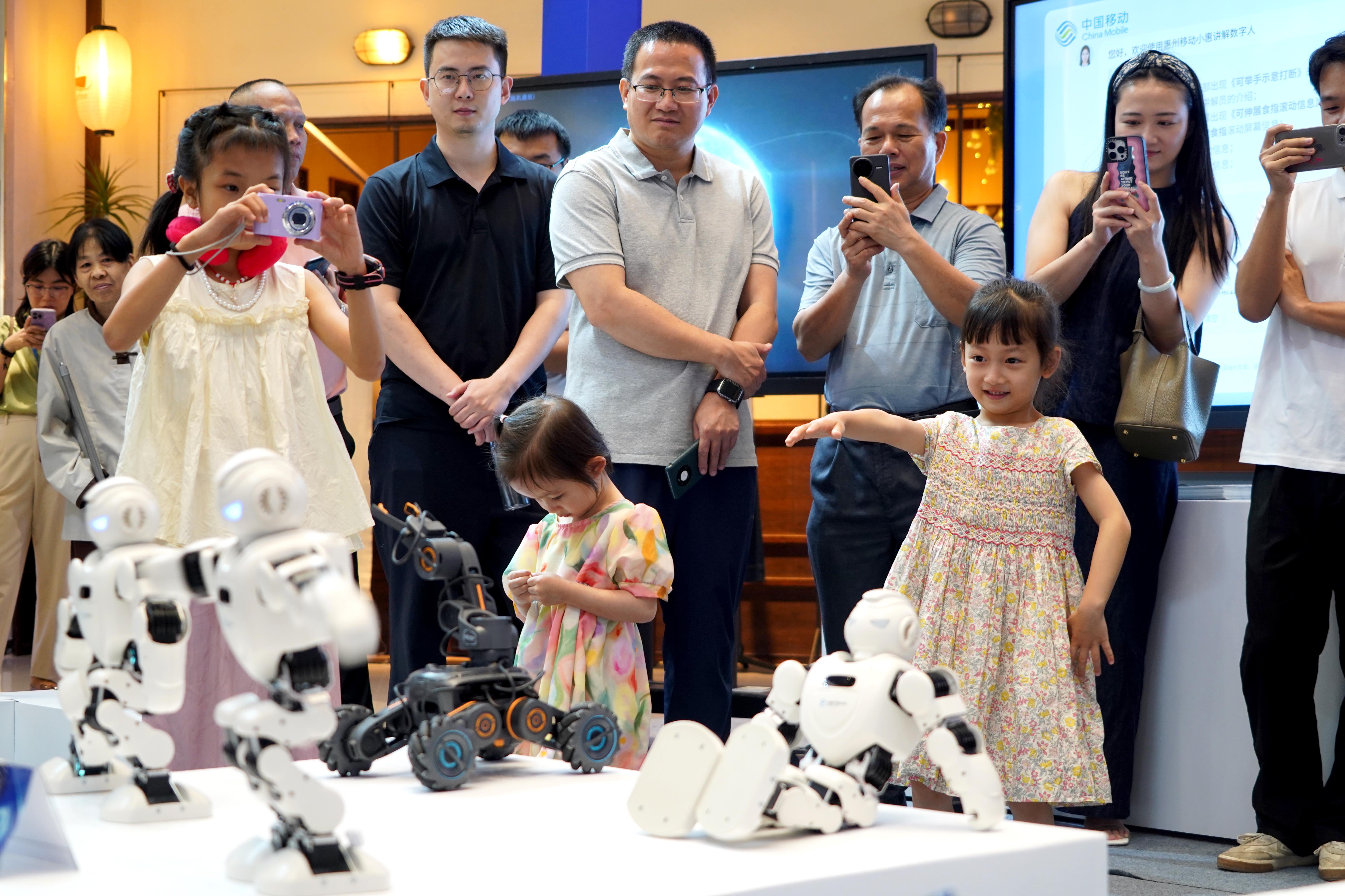 “哇,机器狗跳起来啦!”“我和机器人握手啦!”“你看,机器人在跳舞”……活动现场吸引了不少孩子,他们开心地和AI机器人来了一场“亲密接触”,也让AI技术更加普及。