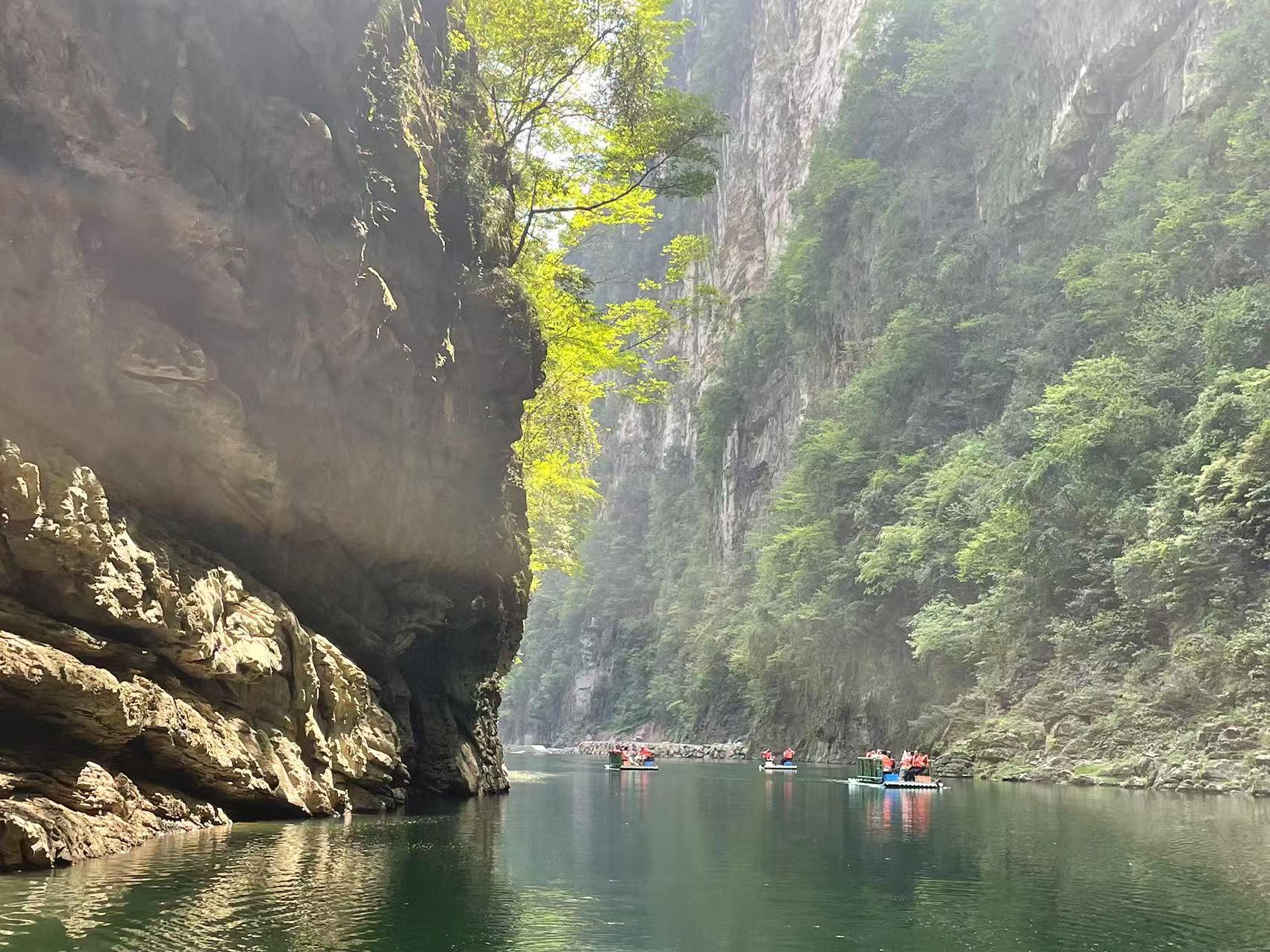 景区内的水上土家婚礼同样是一道不可多得的亮丽风景线。新郎新娘身着绚丽多彩的民族服饰,乘着木船缓缓前行,两岸歌声悠扬、舞姿翩跹,如梦似幻。对歌环节热闹非凡、高潮迭起,新人亲友以歌传情、以舞达意,引得游客连连叫好。
