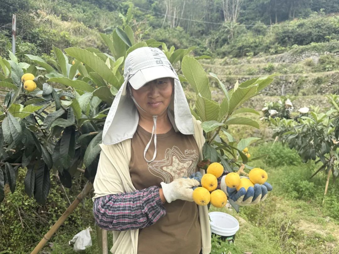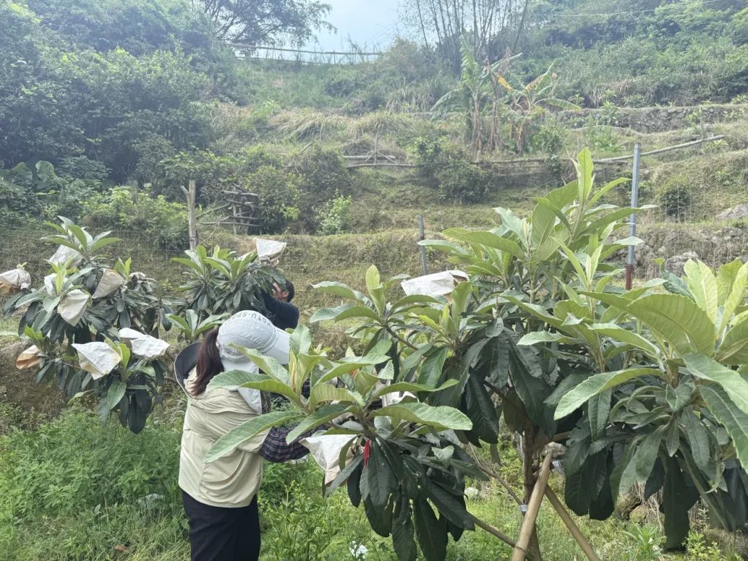 在基地的另一片山头,“三月白”枇杷也迎来了收获期,一簇簇包裹着套袋的果实挂满枝头。打开套袋,圆润饱满的果实呈淡黄色,果香馥郁,让人垂涎欲滴,采摘工人穿行其间熟练地采摘,忙个不停。