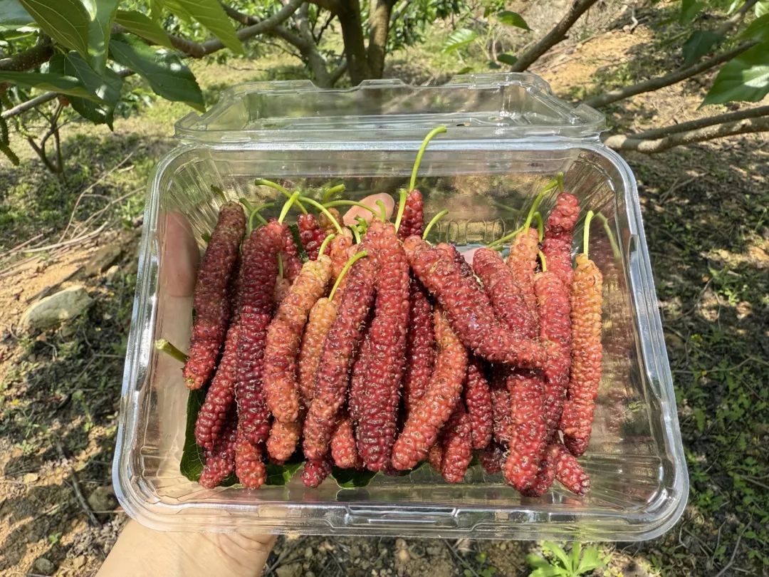 “这个长果桑葚长度通常在8-12厘米之间,最长可达18厘米,当它完全成熟时,其糖度可高达20度以上,食用起来口感极佳,而且它的营养价值也非常高。”