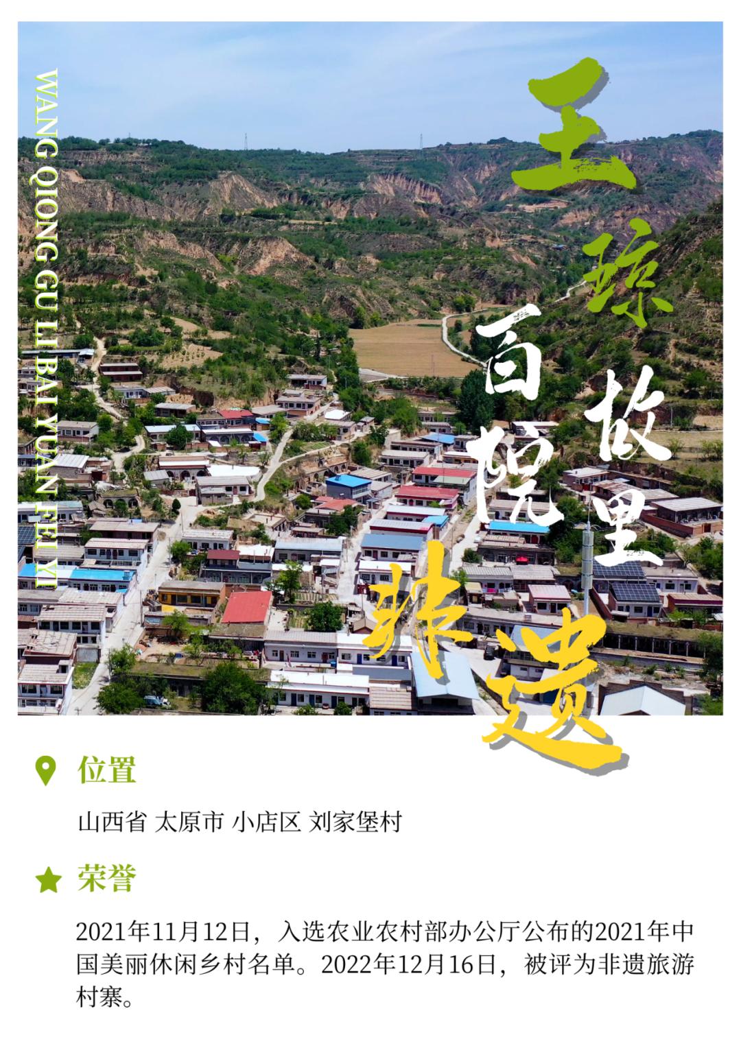 以文化为内蕴,打造“王琼故里·百院非遗”文化村。如今,刘家堡村非遗文化街区内聚集了100余家非遗民俗展馆及传统手工作坊、60余项非遗文创产品、30余种农副产品、30种特色美食、20余家传统民宿,形成了“一院一非遗、一院一文化”的格局,是远近闻名的“非遗小镇”。