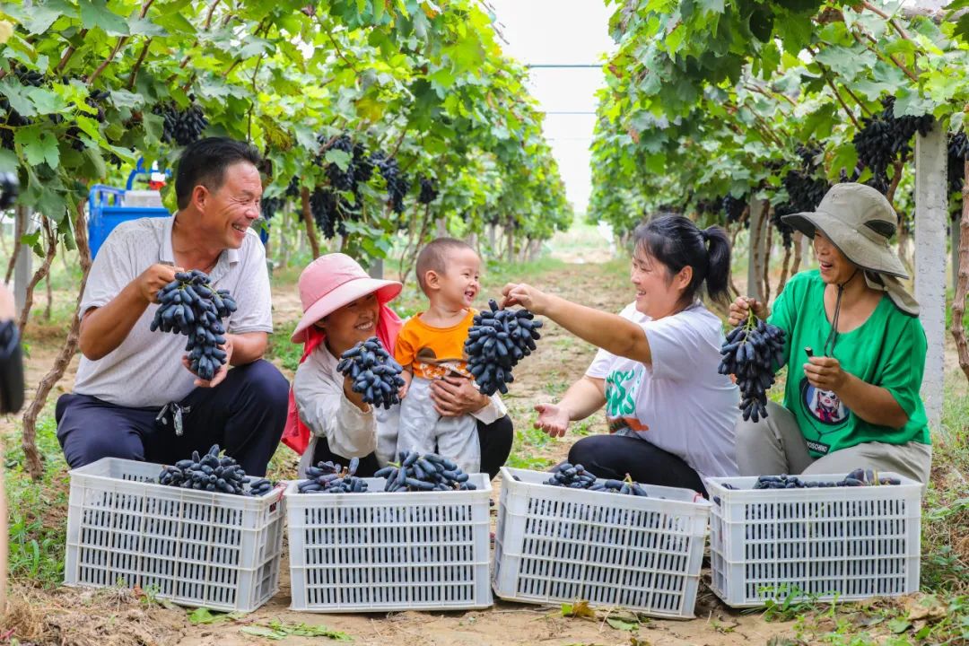 葡萄园里果农们手中捧着饱满果实,脸庞洋溢着丰收的喜悦。