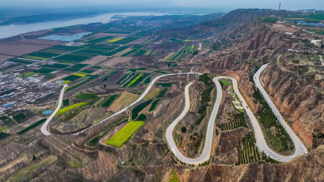 盘山路蜿蜒如丝带缠绕,梯田错落,黄绿交织,勾勒出美丽乡村的独特景致。