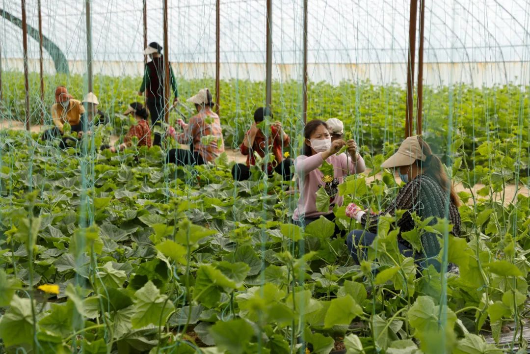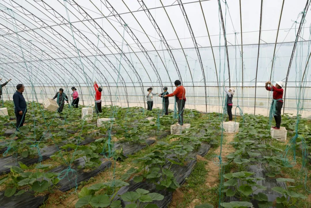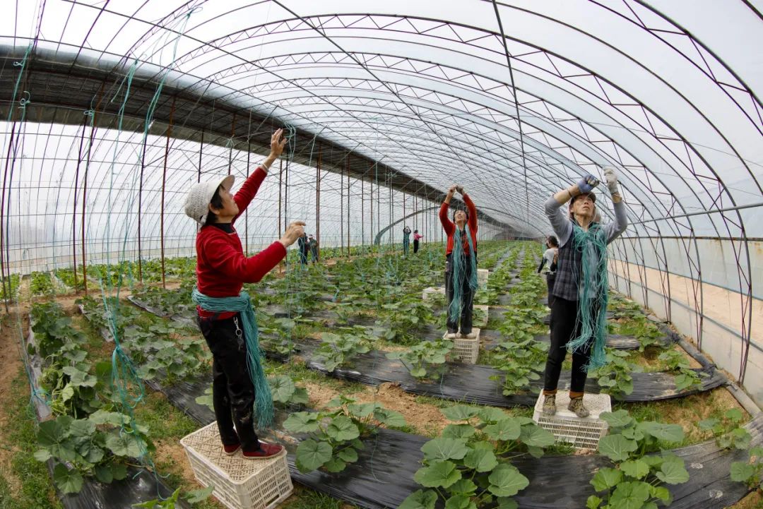 在蔬菜种植基地里,村民正在给黄瓜架秧。